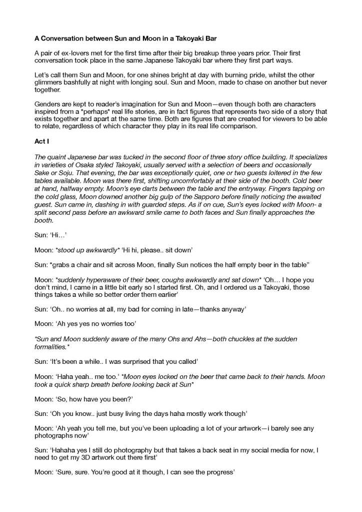 (3) Logline: Sun and Moon, former lovers, meet again in the same Takoyaki bar where they had their big breakup three years ago. As they engage in a heartfelt conversation, they reflect on their past, confront regrets, and find closure, ultimately accepting that their relationship has shaped them into who they are today.