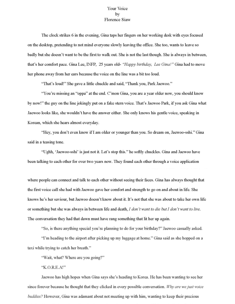 (3) Logline: Gina, who has formed a deep connection with Jaewoo through voice calls, embarks on a trip to Korea and coincidentally ends up following Jaewoo’s recommendations. Unbeknownst to them, they continuously miss each other until a fateful encounter at an animal farm.