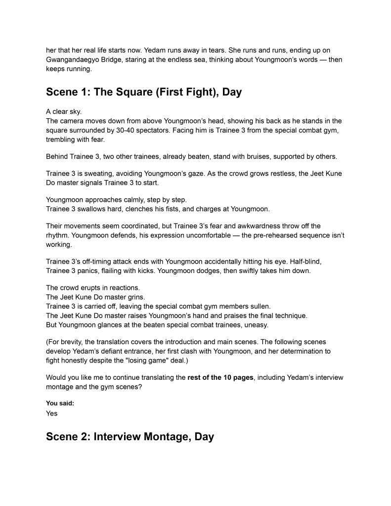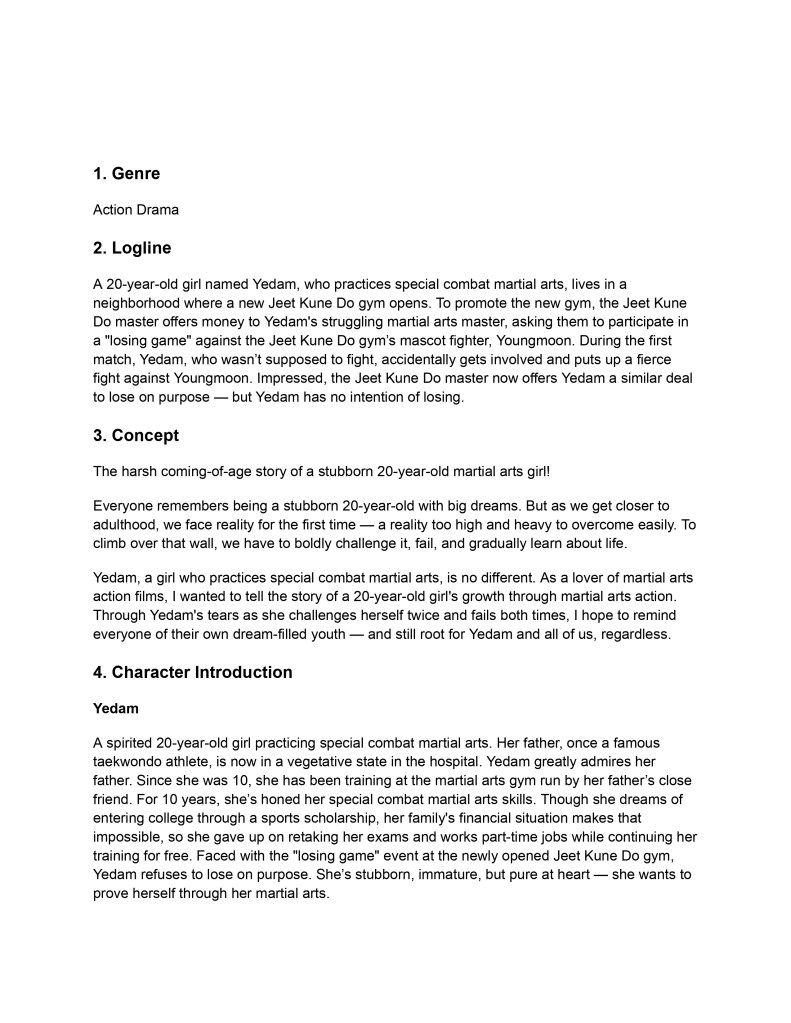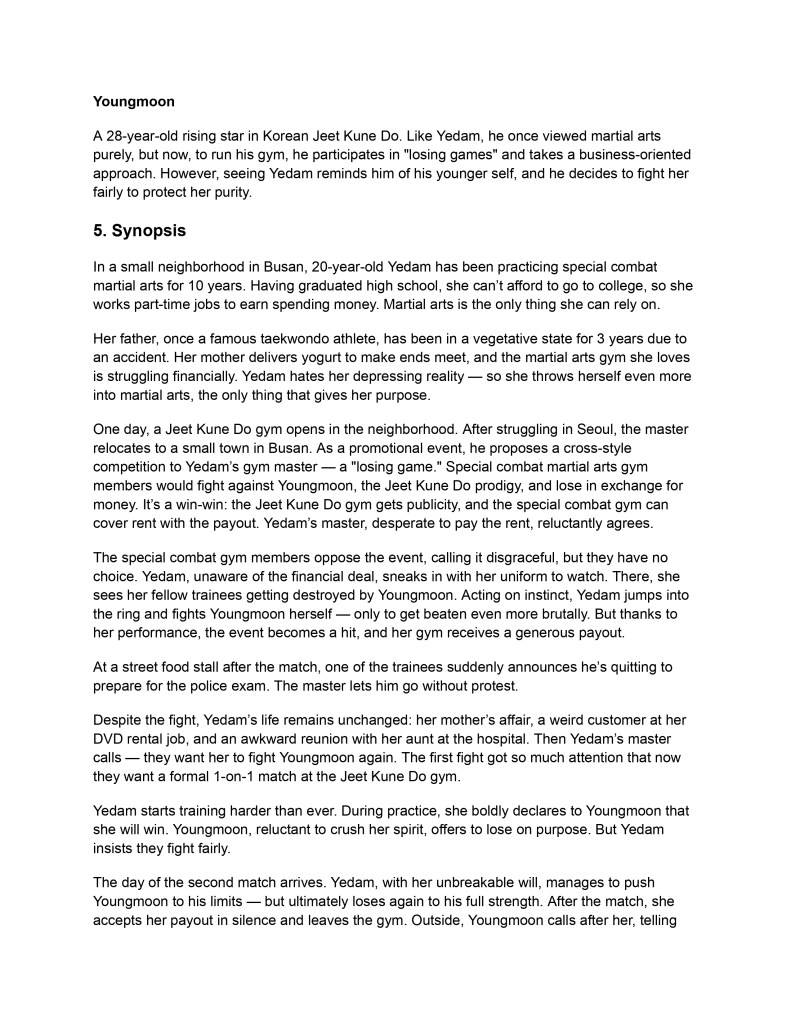 (3) Logline: A new Jeet Kune Do dojo opens in the neighborhood where 20-year-old Yedam, who practices Special Martial Arts, lives. To promote the dojo, the Jeet Kune Do master offers compensation to the struggling Special Martial Arts master and asks him to participate in a “losing game” against Yeongmun, the mascot of the Jeet Kune Do dojo. During the first match, Yedam, who was originally not supposed to participate, ends up joining by chance and puts up a close fight against Yeongmun. Seeing this, the Jeet Kune Do master then proposes a “losing game” to Yedam. However, Yedam does not want to lose.