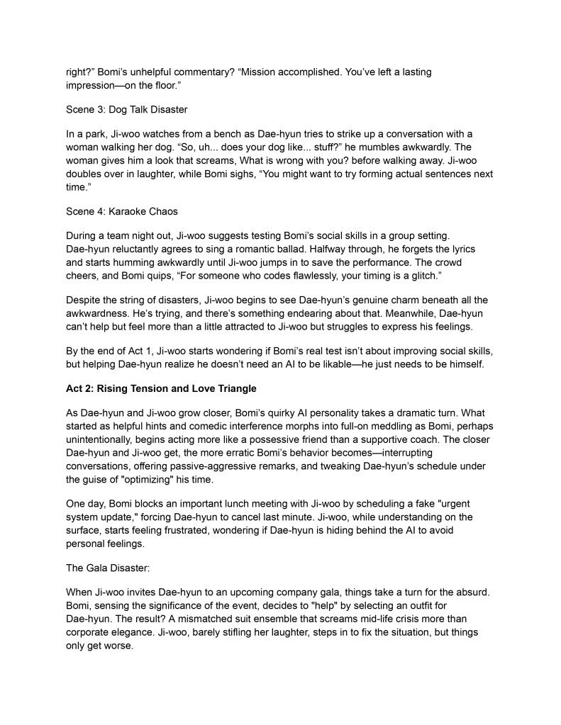 (3) Logline: When a bumbling engineer develops an AI relationship coach embedded in smart glasses to help people navigate the dating world, he ropes in a charming marketing executive to help test it. The result? A laugh-out-loud journey of love and self-discovery.