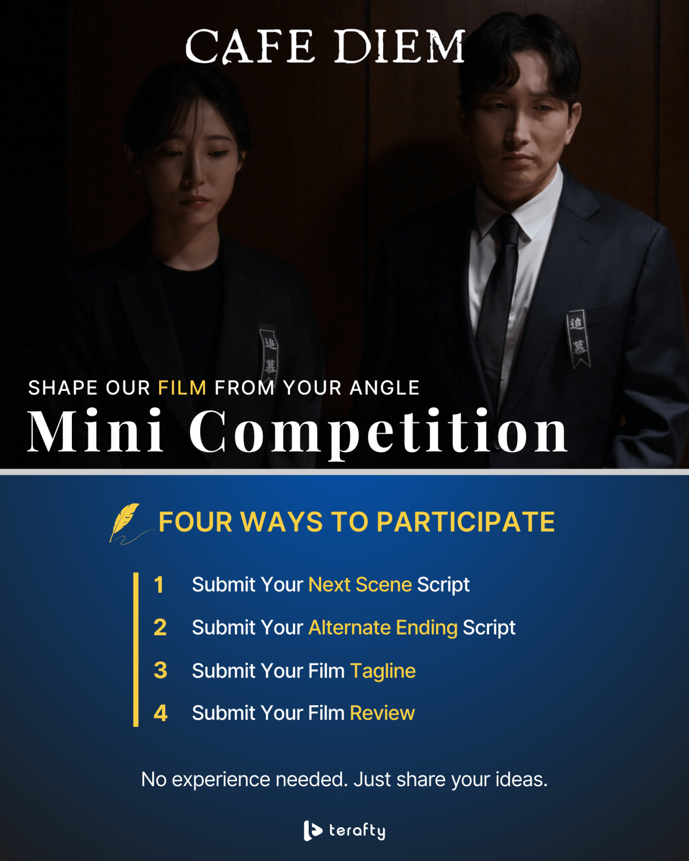 This isn’t your typical fan contest. It’s a chance to take part in the evolving language of storytelling. One scene, one sentence at a time. Cafe Diem is a short film about grief, silence, and emotional detours. But what if the story took a different turn? That’s up to you.