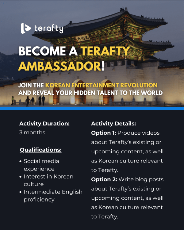 We are excited to announce that applications are now open for the next batch of our highly anticipated program. Join a passionate community dedicated to Korean entertainment and play a key role in shaping how Terafty presents Korean storytelling to the world. Seize this opportunity to contribute to the future of Korean entertainment and share... Continue Reading →